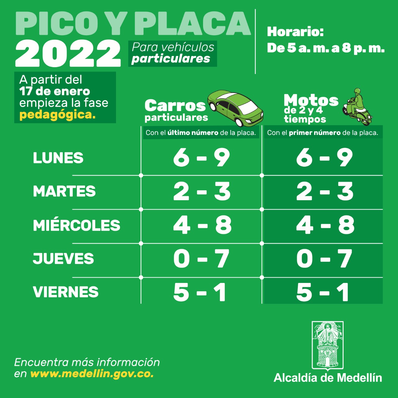 ¡Atención! El 17 de enero comienza la medida de Pico y Placa con dos dígitos por día en Medellín. En la ciudad y el resto de municipios del Valle de Aburrá, comenzará a regir la medida de Pico y Placa de dos dígitos por día, para carros y motos, los días hábiles de lunes a viernes entre las 5:00 a. m. y las 8:00 p.m., como condición de posibilidad para mejorar la circulación vial en la ciudad.
