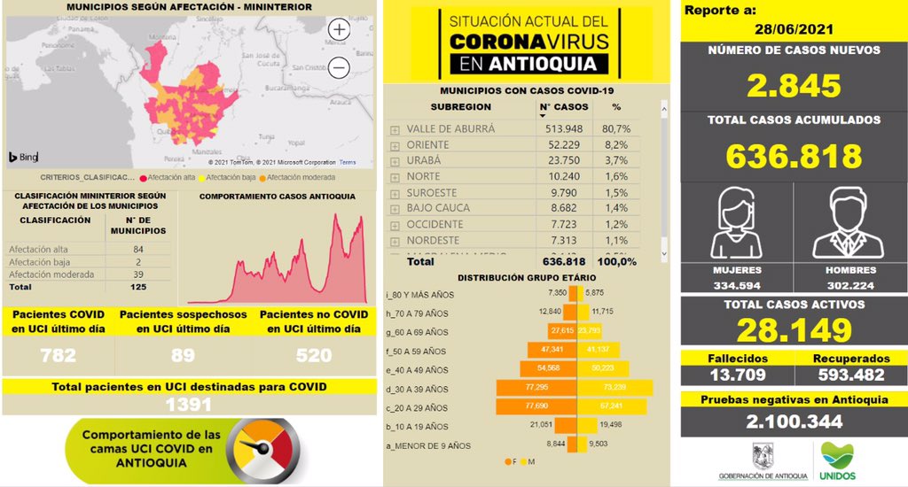 Contagiados por Covid19 en Antioquia se eleva a 636.818. Con cierre al 28 de junio el reporte entregado por el Ministerio de Salud indica que Antioquia tiene 2.845 casos nuevos de Covid19.