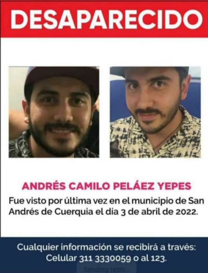 En el municipio de San Andrés de Cuerquia, desapareció en la madrugada del lunes 4 de abril, el ingeniero forestal Andrés Camilo Peláez Yepes, quien había llegado el domingo 3 de abril para adelantar trabajos con las comunidades y las juntas de acción comunal de este municipio para la reforestación ecológica por Hidroituango.